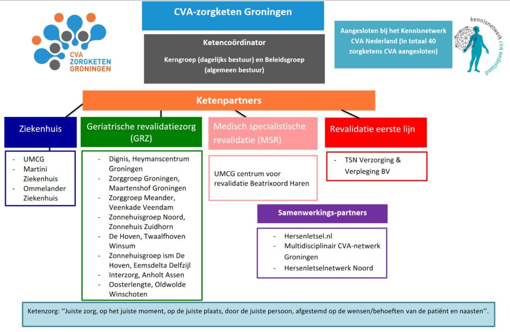 De CVA-zorgketen Groningen is een samenwerkingsverband van 12 organisaties in de gezondheidszorg. Het gaat daarbij om 3 ziekenhuizen, 7 verpleeghuizen (die Geriatrische Revalidatie na CVA bieden), een revalidatiecentrum, een thuiszorgorganisatie en het multidisciplinair CVA-netwerk Groningen.