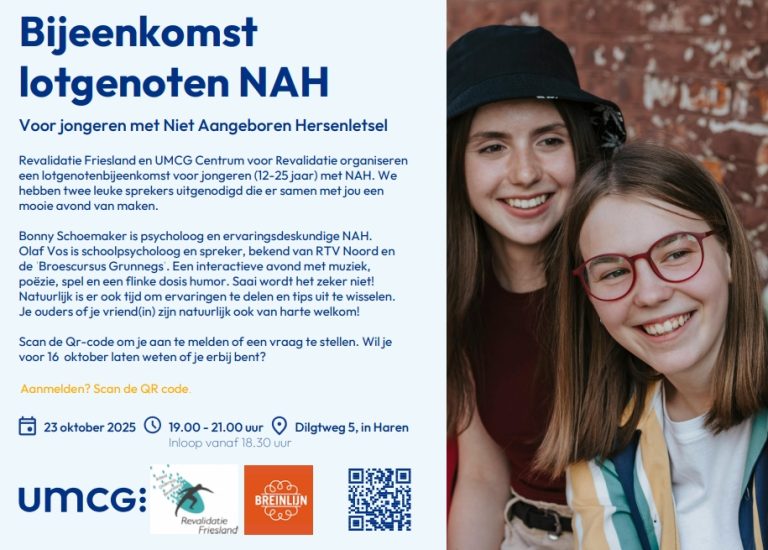 Voor jongeren (11-25 jaar) met Niet Aangeboren Hersenletsel organiseren Revalidatie Friesland en UMCG Centrum voor Revalidatie een lotgenotenbijeenkomst op 23 oktober om 19.00-21.00 uur. Inloop is vanaf 18.30 uur. Locatie: